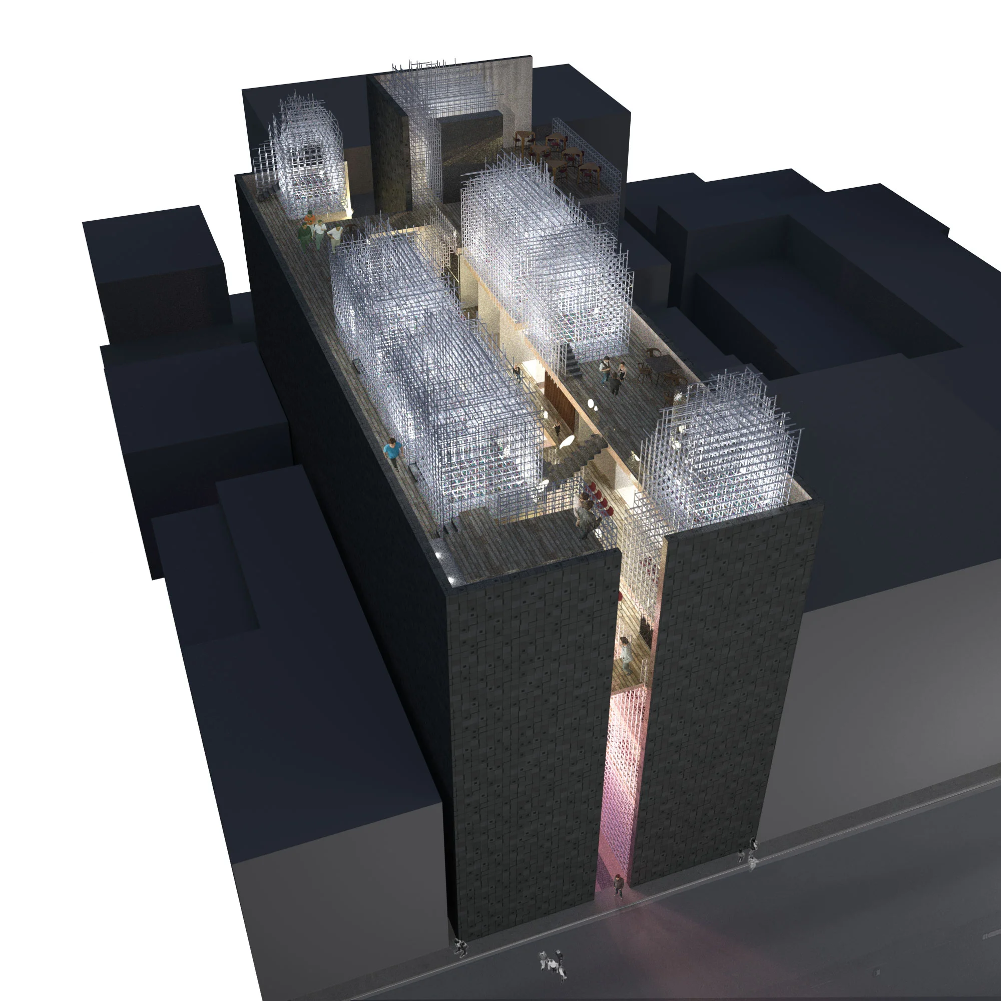 Vertical Alley explores the intersection of public and private spheres in response to the rising density of emerging megacities. As personal space shrinks, a new lifestyle of urban nomadism arises in which a variety of businesses, along with the city itself, become an extension of the home. Tokyo leads this development of dividual space with small rentable booths like the Manga Kissa, the Kenko Land Sauna and the Love Hotel, but these remain solitary and inviolable, reinforcing a disconnect where people remain alone, even when surrounded. Vertical Alley redresses this paradox with community and permeability, encompassing an array of uses from refuge to social club.